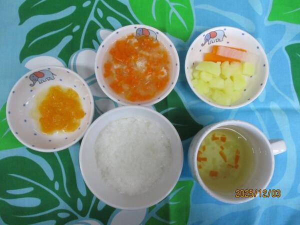 | 〈10時のおやつ〉 ・牛乳🥛 ・もも缶🍑 〈給食〉 ・麦ごはん ・かみかみバーグ ・人参の甘煮 ・切り干し大根のみそ汁 〈15時のおやつ〉 ・ミルクココア ・さつま芋の甘煮🍠 |