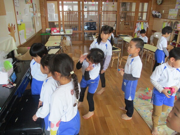 | 今日は初めてじゃんけん列車をしました🚃✊ 「グーチョキパー」を確認したり、ルールを知り、ゲームに臨みました✨ まだ難しい部分もありましたが、とっても楽しんでいましたよ💟😆 その後は、リトミックしたり🎵園庭に行きました💛⛄ |
