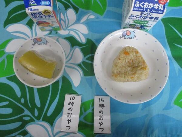 | <10時のおやつ> ・牛乳🥛 ・チーズ <給食> ・キャロットパン ・ブイヤベース ・小松菜のオイスターソース炒め <15時のおやつ> ・スキムミルク ・こぎつねごはん |