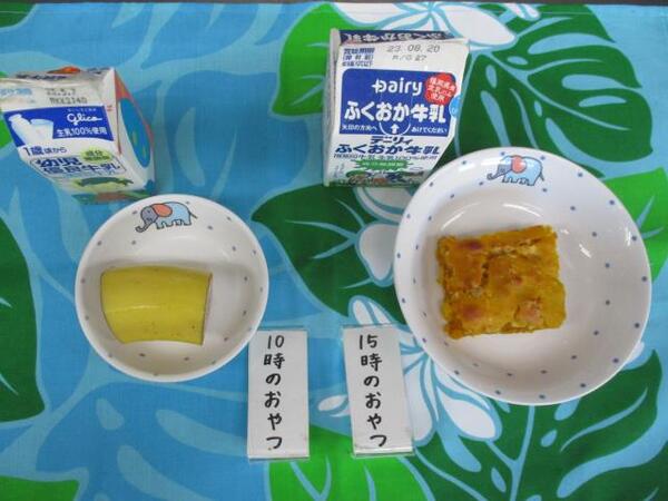 | 〈10時のおやつ〉 ・牛乳 ・チーズ🧀 〈給食〉 ・麦ごはん ・牛肉とピーマンの炒め煮 ・豆腐と野菜のすまし汁 〈15時のおやつ〉 ・スキムミルク ・きな粉パン |